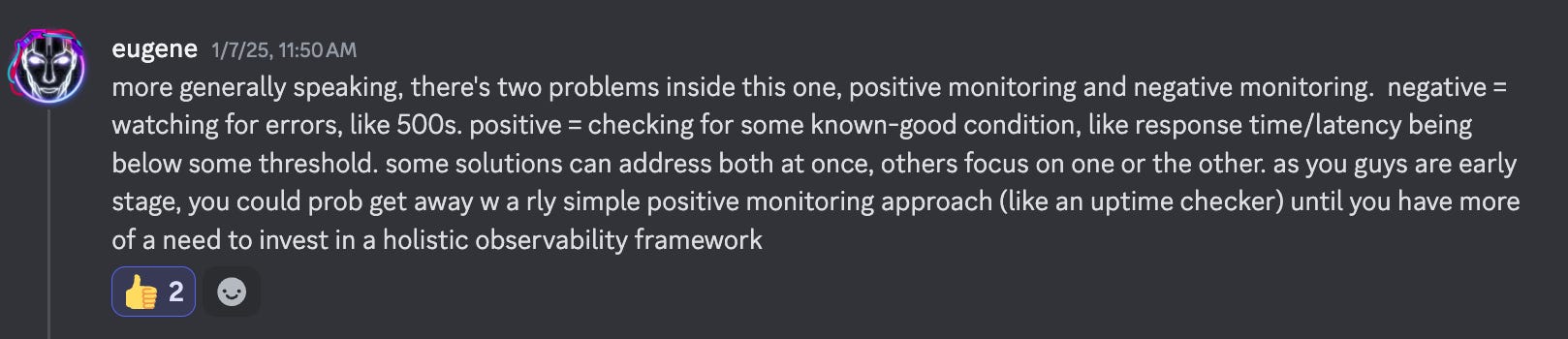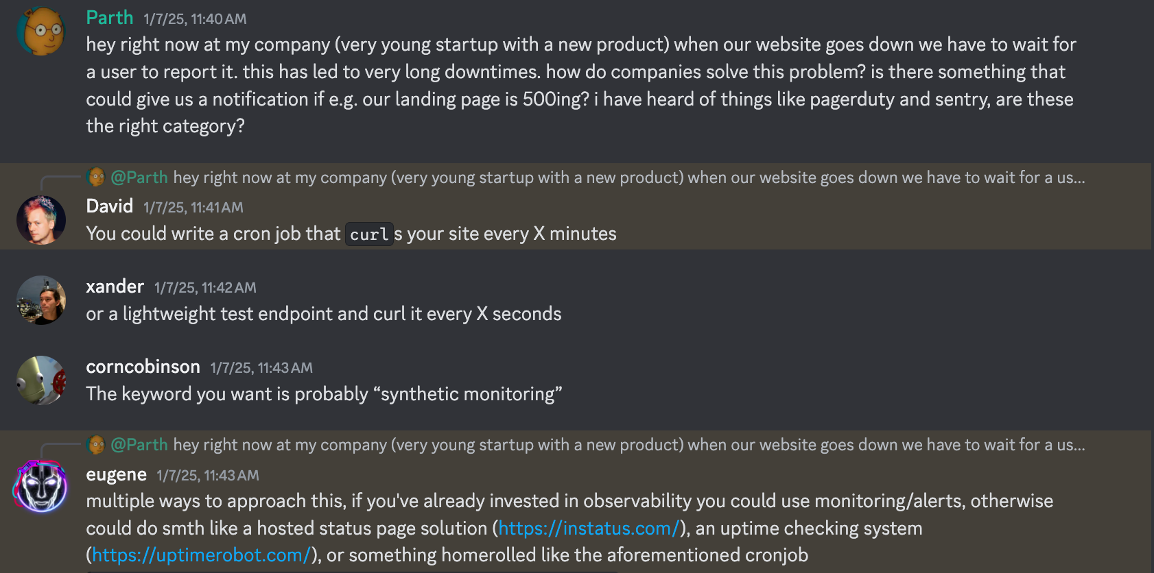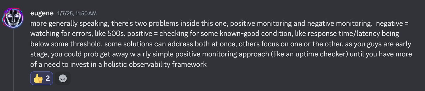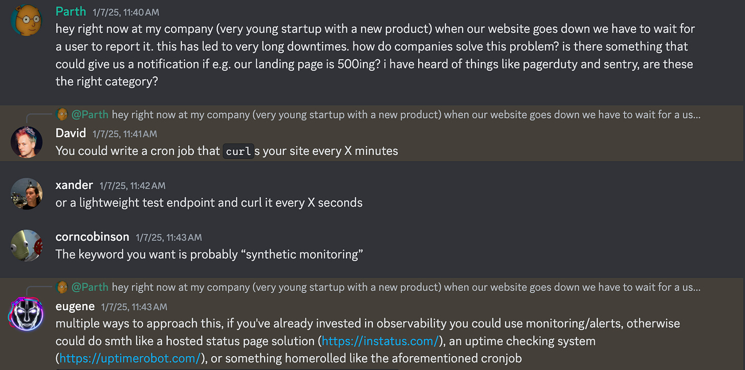 Great engineers seem to have an enormously wide range of capabilities and skills. I notice this is surprising to me - I think this is because I expected there to be very specialized frontend engineers, backend engineers, people who fiddle with React and so forth. But the engineers in my community who I admire seem to have lots of different kinds of knowledge. Last week I asked the Fractal Tech discord for help with catching downtime on our site, and was super amazed and humbled by the helpful responses around observability and QA.