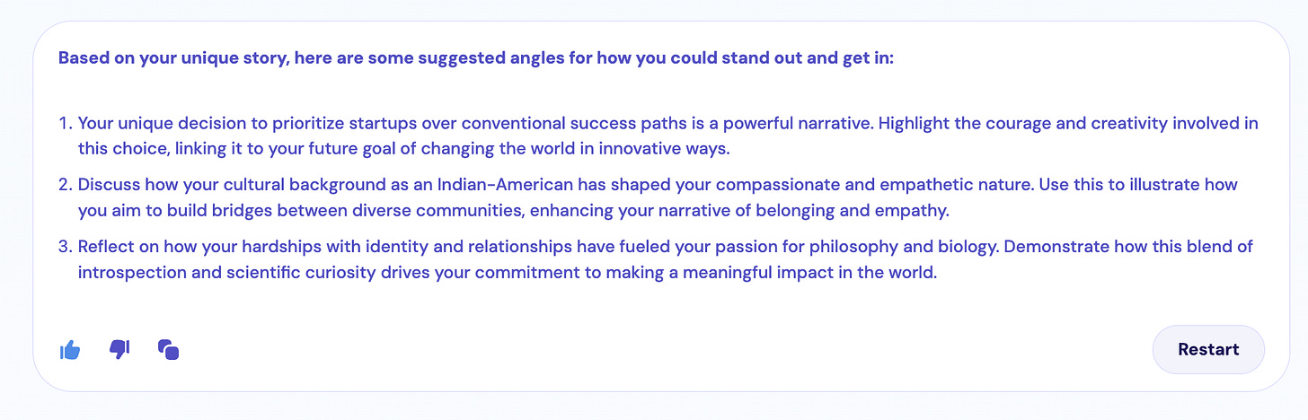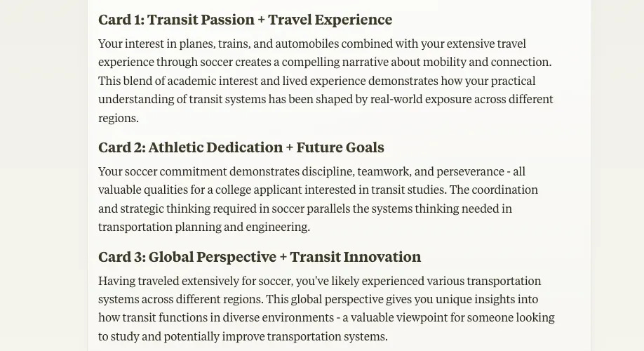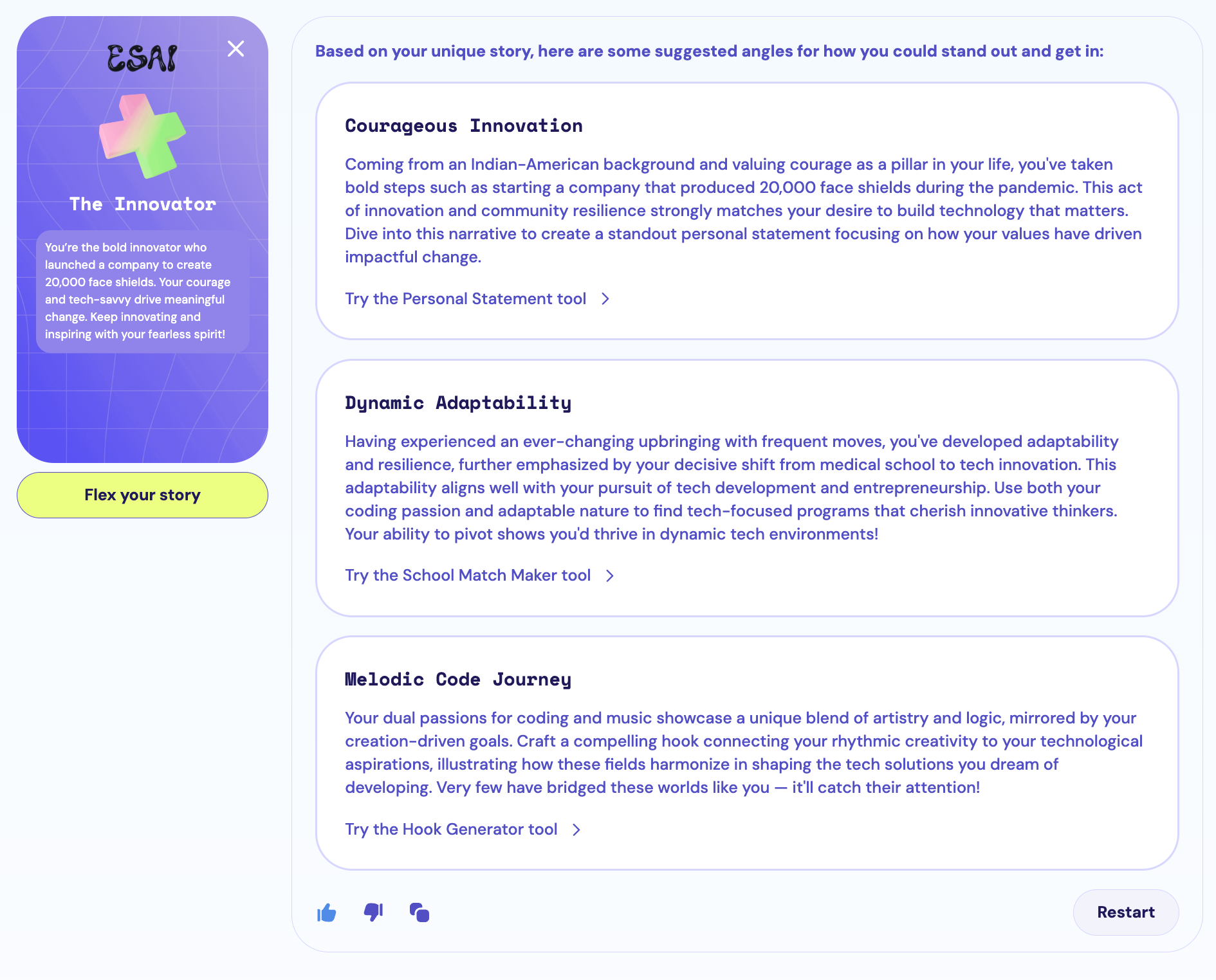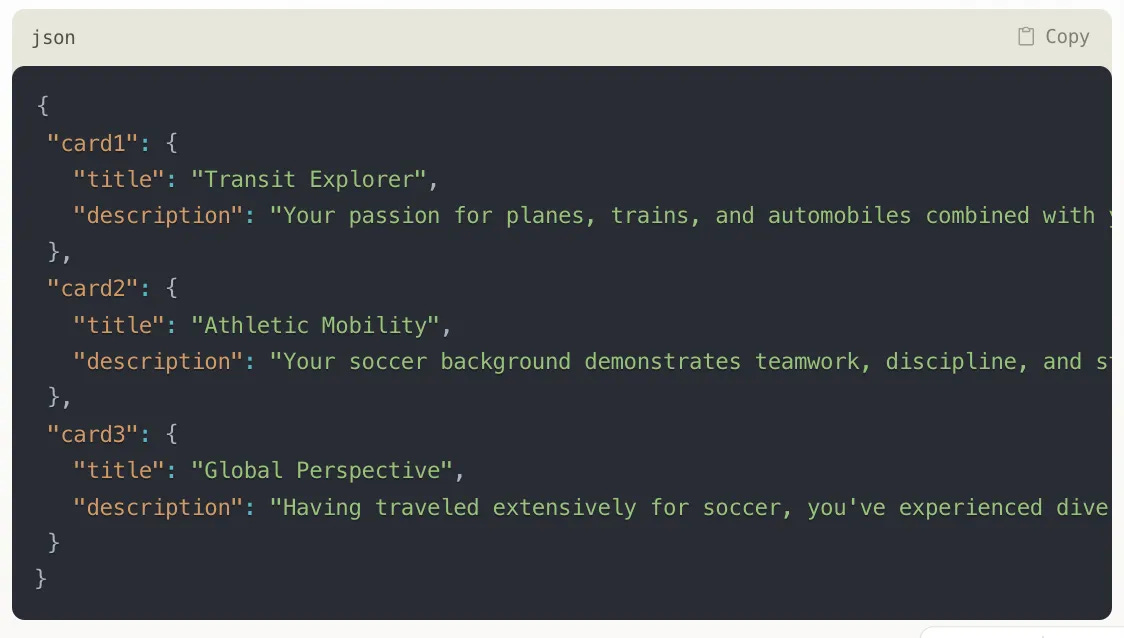 At ESAI, we use AI to help students with the college admissions process. Previously, when our AI tools would output a long block of text with college application advice, we couldn't select and save pieces of those responses. Even if we asked the LLM to generate "three recommendation cards," from the machine's perspective, there was no distinction - it was all just text.