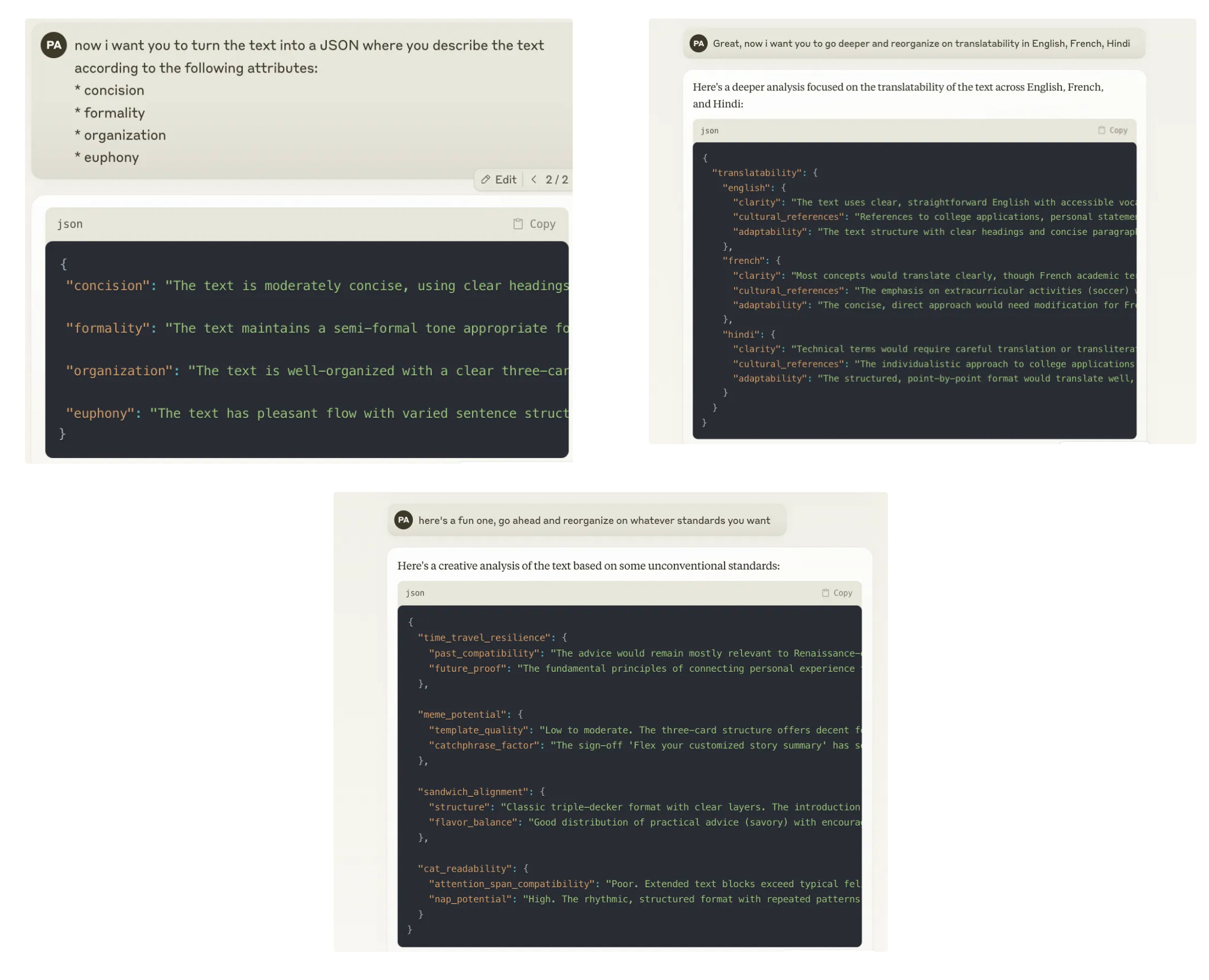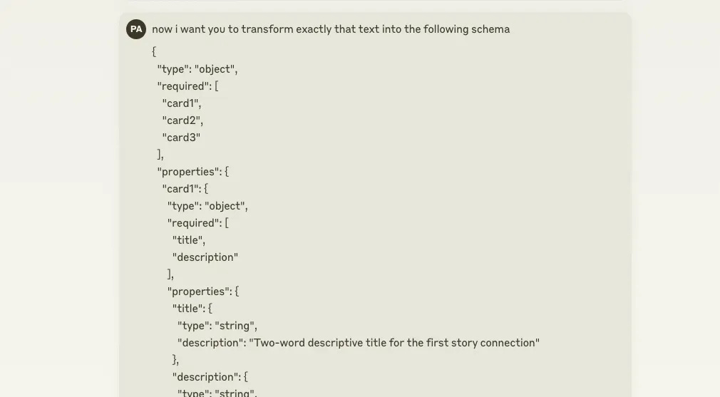 We wanted to break up how the outputs looked to users. To “teach” our frontend to render each the content for each card separately, we had to give it structured data with a defined list of cards and their titles, descriptions, and tool links. Now we’re moving into letting users save individual cards, so we’re “teaching” our backend what a card is and what a bucket is. Next, structured extraction can enable even more UX wins, like generating and rendering links to multimedia within our cards.